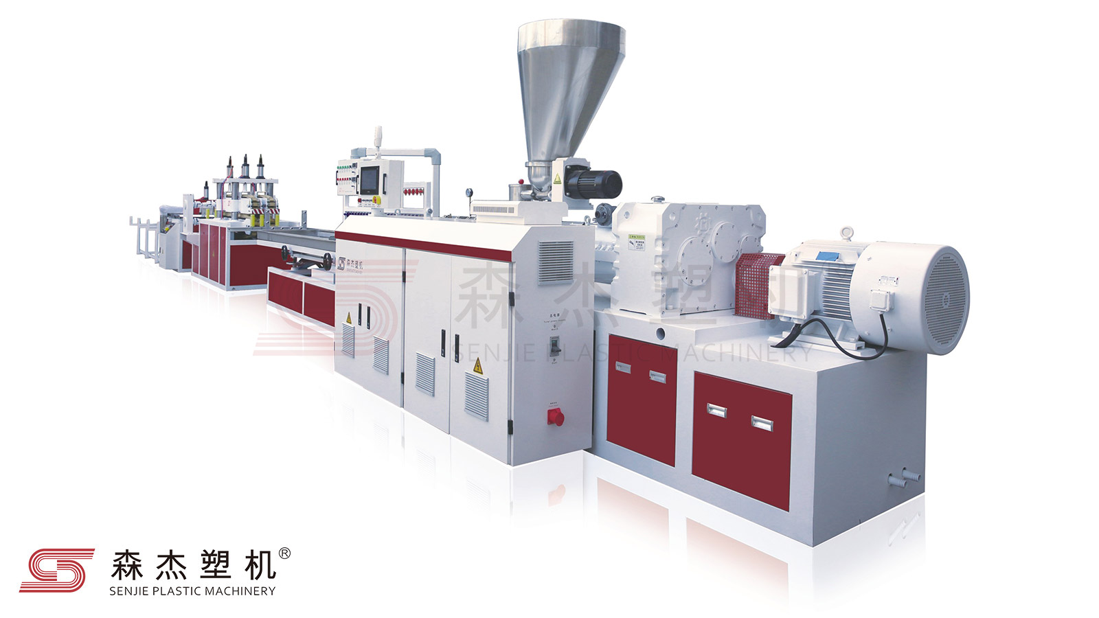 該生產(chǎn)線由錐形雙螺桿擠出機,真空定型臺,雙牽引,雙切割機,雙翻料架組成。主機進口溫控表,進口氣動元件,確保機器穩(wěn)定可靠運行。采用雙履帶雙變頻調(diào)速控制,雙定長切割有效防止產(chǎn)品的出料快慢,牽引履帶均采用正壓背壓控制,防止牽引打滑或者過壓。