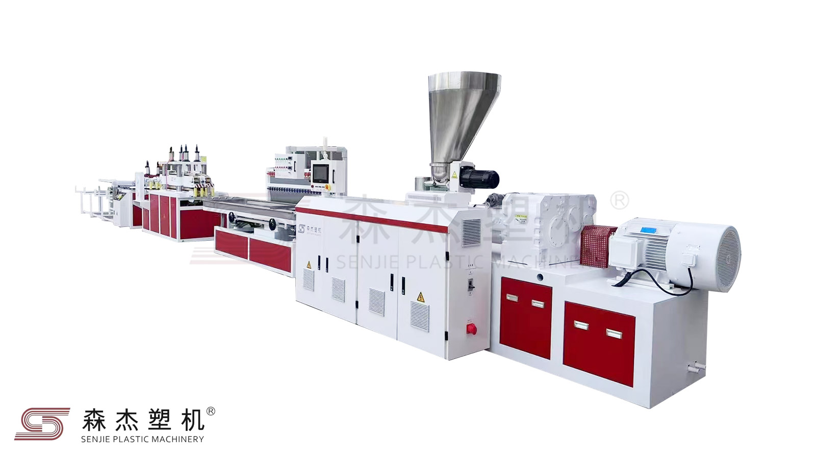 真空定型臺(tái)采用特殊加大漩渦氣泵以及水冷卻系統(tǒng),便于冷卻定型,特別的水平傾斜控制獨(dú)特的三維調(diào)整控制,使得操作簡(jiǎn)便得以更好體現(xiàn)。根據(jù)不同模具,定徑臺(tái)可選用以滿足高速擠出的要求。牽引機(jī)采用獨(dú)特升降技術(shù),上履帶背壓控制,工作平穩(wěn),可靠性好、牽引力大,可自動(dòng)定長(zhǎng)切割,并配置粉塵回收裝置??缮a(chǎn)PVC門窗異型材, 木塑門套,PVC線槽,踢腳線,百葉片等
